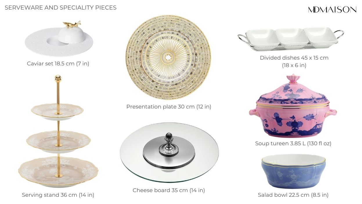 Beyond individual place settings, you’ll always find serving, specialty, and accessory pieces on the table, designed for communal dining or specific service needs: for example, for presenting main meat and fish courses, for cakes, pies, cheese, and cold appetizers. You can see some of the most attractive examples in our illustration. While standard dinner plate size falls within a fixed range, these specialty items offer a much more diverse range of dimensions. You’ll find all sorts of elegant designs to choose from in the Ginori Diva or White Satin by J.L Coquet.