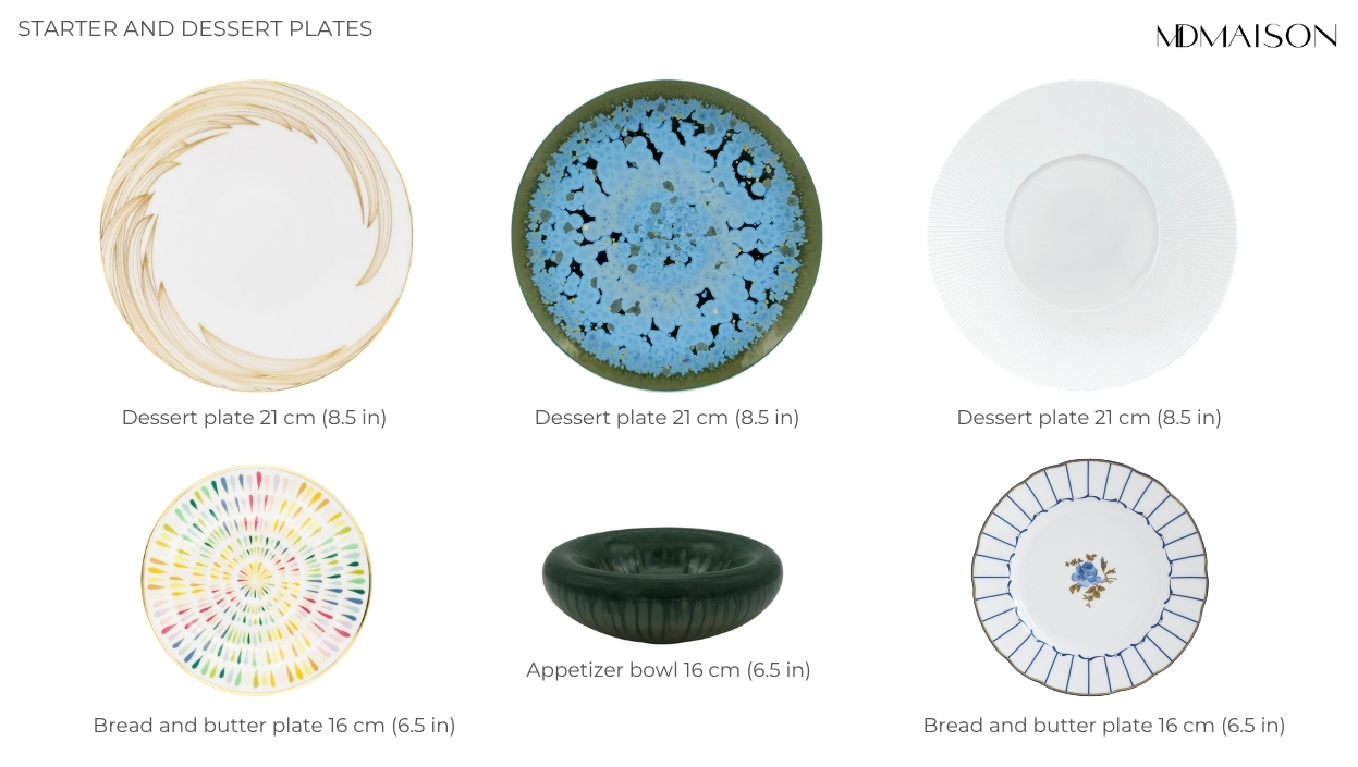 Since the primary function of these items is either to prepare for the feast or to conclude it, this category features the smallest diameter of a dinner plate. Their format helps hosts avoid overdoing it with appetizers and makes fancy dessert porcelain with sweets look even more elegant and charming.