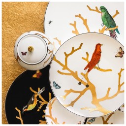 The Aux Oiseaux dinnerware collection by Bernardaud invites nature's charm to your table. Showcasing a vibrant array of birds elegantly perched on gilt branches, the fine Limoges porcelain is further adorned with colorful butterflies fluttering above. Influenced by curiosity cabinets and the techniques employed in traditional Japanese prints, Bernardaud's imaginative décor transports guests to the chambers of wonders of the sixteenth and seventeenth centuries. These precursors to modern museums displayed a variety of objects, including the captivating avian creatures now celebrated in the Aux Oiseaux collection.