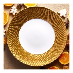 Twist Gold by Bernardaud infuses your table with captivating golden accents, whether paired with the white Twist dinner service or standing out on its own. The elaborate design, engraved on the rim of the plates and the exterior of various pieces, displays a stunning contrast of matte and glossy finishes illuminated by light. Crafted from the finest Limoges porcelain, the Twist Gold dinnerware is produced in the esteemed Bernardaud factory, reflecting the French family-owned company's passion for exceptional craftsmanship and its position as a leading manufacturer of Limoges porcelain since 1863.