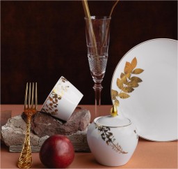 The Vegetal Gold dinnerware collection with refined shapes and classic gold accents. The set features exquisite gold depictions of branches, stems, and leaves on top-quality Limoges porcelain. The pictures of plants in gold look like a fall scene in the evening sun. The mix of gold shades and shiny and dull spots makes a special look. The set has round, oval, and square plates, bowls of various sizes and shapes, and other things for serving.