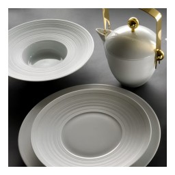 The "Hémisphère" collection from J.L. Coquet is a luxurious line of porcelain plates that are known for their wide, finely structured rims and velvety surface texture. The production process for these plates involves about 20 different steps, including traditional methods for preparing the raw porcelain paste and a satin finish applied with a brush and fired at high temperatures. Coquet's Limoges porcelain is renowned for its shining white color and delicate appearance, and the company was even awarded the title of "Living Heritage Company" by the French government in 2010 for its unique approach to porcelain production. Despite its high-end nature, the "Hémisphère" dinner service is suitable for everyday use and can even be placed in the dishwasher. It is favored by top chefs for its durability and is available in other colors beyond white.