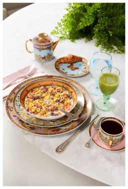 The China collection by Rosenthal Versace is a mix of different historical periods and cultures. Dinnerware decorated with these exotic jungle-inspired patterns. Even though it has baroque elements, it maintains a balance of luxury without going overboard. The fairy-tale-inspired decor is set against a pink-and-blue backdrop, creating a captivating atmosphere. The detailed designs combine rococo and modern elements, with glossy gold accents that add to the luxurious feel of the china service.